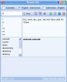 Kamus 2.04 merupakan software untuk menerjemahkan dari bahasa inggris ke bahasa indonesia atau dari bahasa indonesia ke bahasa inggris. Software ini cukup bagus untuk digunakan dalam menerjemahkan kata per kata.